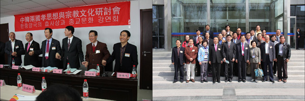 2011年4月13日,"中韓兩國孝思想與宗教文化學(xué)術(shù)研討會(huì)暨兩國學(xué)術(shù)機(jī)構(gòu)、團(tuán)體交流協(xié)議簽約儀式"在山東大學(xué)儒學(xué)高等研究院舉行。本次研討會(huì)由山東大學(xué)儒學(xué)高等研究院、韓國圣山孝道大學(xué)院、濟(jì)南市傳統(tǒng)文化研究會(huì)、韓國大田廣域市孝指導(dǎo)士協(xié)會(huì)等單位主辦,山東省老齡委孝文化專業(yè)委員會(huì)、韓國大田廣域市、韓國孝運(yùn)動(dòng)中央總會(huì)、韓國大田廣域市孝實(shí)踐運(yùn)動(dòng)本部聯(lián)合承辦。會(huì)議由山東大學(xué)儒學(xué)高等研究院副院長顏炳罡教授主持,來自中、韓兩國的專家學(xué)者逾80人參加了此次研討會(huì)。