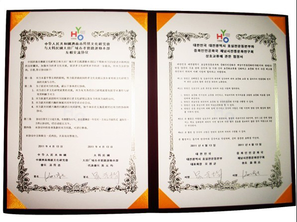 大會(huì)第二階段為簽署交流合作協(xié)議。致辭結(jié)束后,湯會(huì)長代表濟(jì)南市傳統(tǒng)文化研究會(huì)與韓國大田廣域市孝實(shí)踐運(yùn)動(dòng)本部會(huì)長吳元均先生簽署了兩個(gè)民間團(tuán)體之間的合作協(xié)議。按照協(xié)議規(guī)定,在未來的幾年中,兩會(huì)之間將加強(qiáng)交流與互訪,共同推動(dòng)孝文化的研究、實(shí)踐、推廣與傳播。研究會(huì)副會(huì)長兼秘書長趙衛(wèi)東、副秘書長鄭朝霞、彭耀光、戴佐義以及部分會(huì)員參加了簽署儀式。