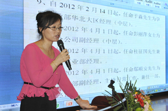 接下來,人力資源部經(jīng)理于鳳仙女士上臺宣讀了《2012年機(jī)構(gòu)調(diào)整及人事任免決定》。隨后,湯經(jīng)理上臺為新任命的12名管理人員頒發(fā)了任命書。接過紅燦燦的任命書,同時也接過一份沉甸甸的責(zé)任,大家紛紛表示:一定不辜負(fù)公司領(lǐng)導(dǎo)的重托與信任,在新的崗位一定會再接再厲,繼續(xù)努力,為公司發(fā)展做出更大的貢獻(xiàn)!