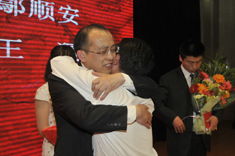 湯經(jīng)理與忠誠敬業(yè)貢獻(xiàn)獎獲獎人員熱情擁抱 湯經(jīng)理與忠誠敬業(yè)貢獻(xiàn)獎人員合影