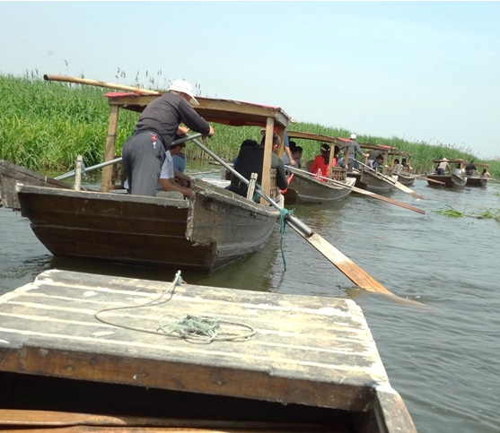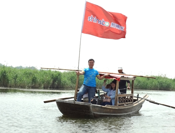 上午10:00,經(jīng)過2個(gè)多小時(shí)的路程我們到達(dá)本次旅游的目的地——東平湖。等大家依次從大巴車上下來(lái)時(shí),發(fā)現(xiàn)5位當(dāng)?shù)氐臐O民早已劃著小船等候在岸邊,伴隨著一首慷慨激昂的《好漢歌》,大家開始泛舟湖上,鮮紅的新稀寶大旗第一次飄揚(yáng)在廣闊的東平湖上。