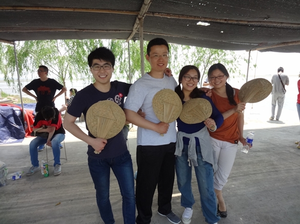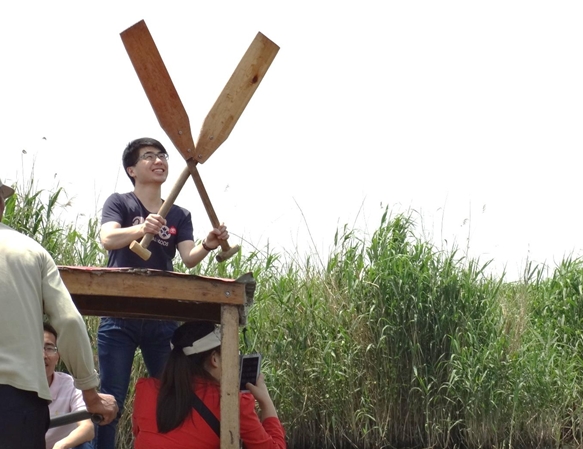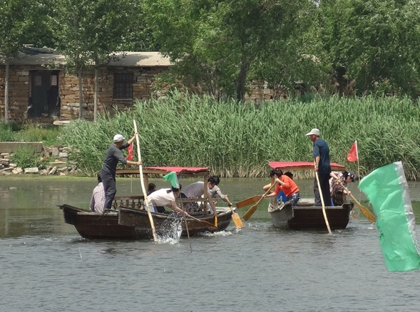 在豐盛的全魚宴之后,我們迎來(lái)了本次東平湖之游中最為有趣的項(xiàng)目——劃船比賽。比賽有4隊(duì)參賽,分別經(jīng)過初賽和決賽,最后決出總冠軍。為公平起見,每隊(duì)由3男2女組成,船家掌控方向,隊(duì)員負(fù)責(zé)劃槳,第一個(gè)到達(dá)終點(diǎn)的隊(duì)獲勝,在一聲嘹亮的號(hào)聲中兩隊(duì)出發(fā),岸邊隊(duì)友們擊鼓吶喊助威,隊(duì)員們個(gè)個(gè)奮力向前劃,木漿濺起的水花打到后面隊(duì)員的臉上、衣服上、眼鏡上,顧不了那么多了,只有使勁向前劃。這樣的場(chǎng)景可樂壞了撐船的船家,笑聲、加油聲、擊鼓聲、號(hào)子聲讓整個(gè)比賽異常激烈。兩輪比賽之后船家為獲勝團(tuán)隊(duì)頒發(fā)了東平湖紀(jì)念品——手編蘆葦扇,手編的小扇扇起了無(wú)限的清涼。