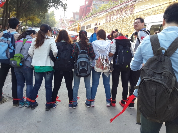 那么問題來了,爬山闖關哪組強?爭先恐后勁頭足,第一關就是同舟共濟!首先出發(fā)的是由張新軍經理帶領的沖鋒隊——“沖鋒沖鋒,沖向巔峰!”,緊接著,“猛虎上山,所向無敵!”、“火箭,火箭,一飛沖天!”……隨著一聲聲響亮的隊名口號響起,其他小組也陸續(xù)出發(fā)!相鄰兩腿相連,共同走路從“開元盛境”到“開元遺韻”牌坊,約300米的距離,大家肩并肩,手挽手,齊心協(xié)力把關闖!就連游玩的路人都被我們這有趣的景象吸引住了,甚至有的路人還為我們加油打氣,大家從剛開始的分散,到慢慢找到竅門,再到最后的完美默契,這300米的路程拉近了我們彼此之間的距離。這一關讓我們懂得團隊協(xié)作的必要性,想要達到最終目標,需要每個人的相互配合,共同努力!