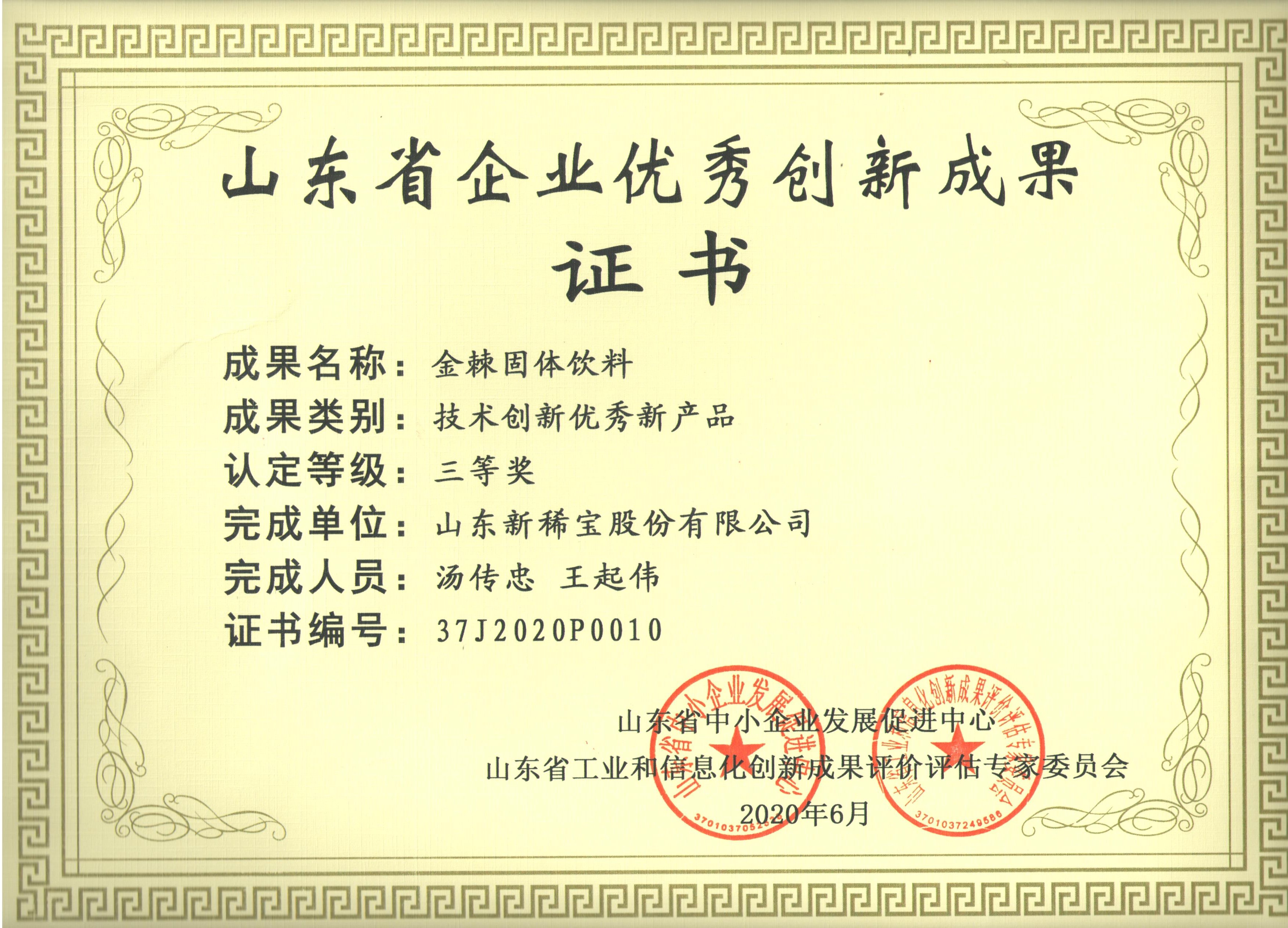 金棘固體飲料獲得技術創(chuàng)新優(yōu)秀新產(chǎn)品三等獎