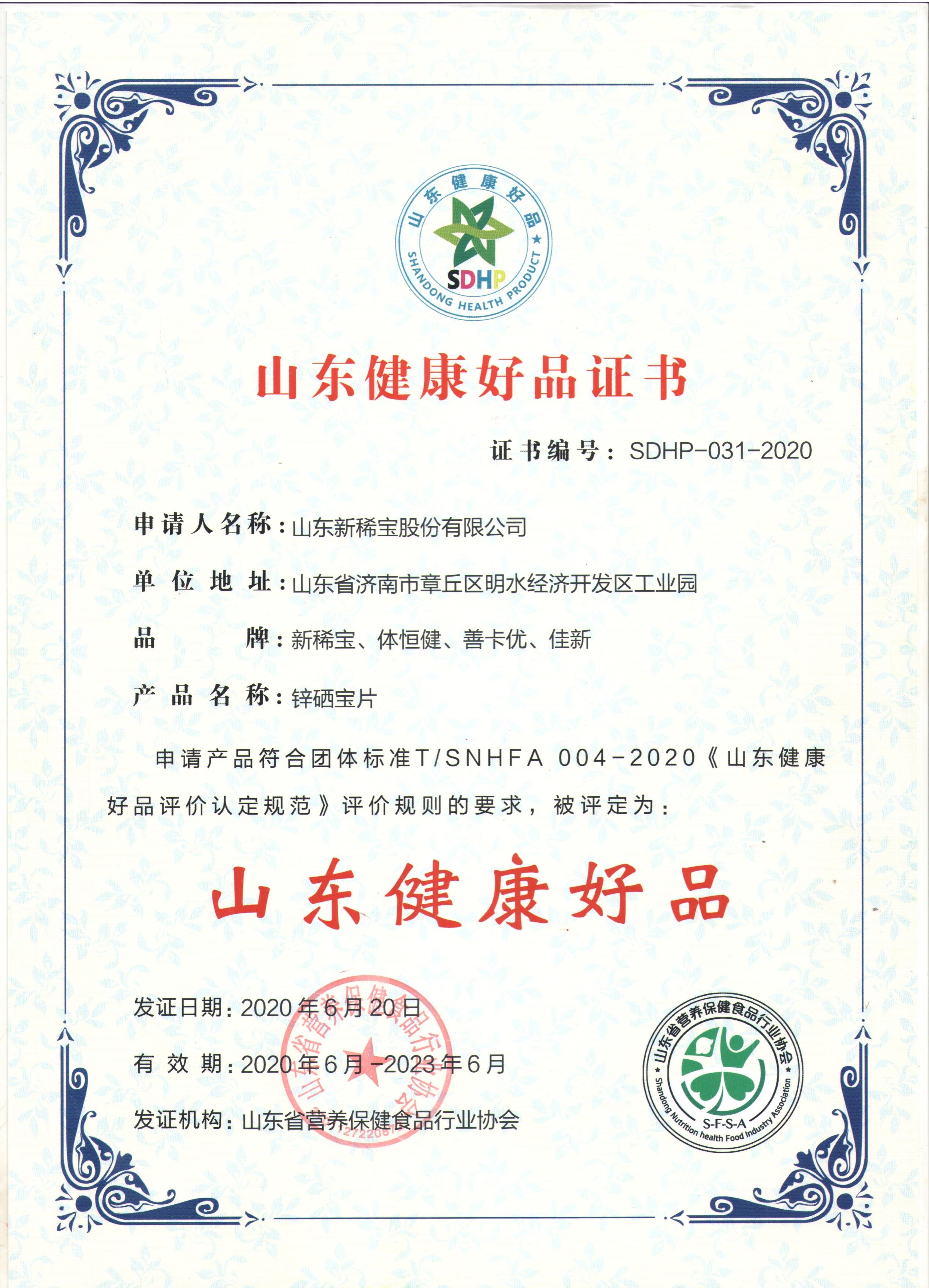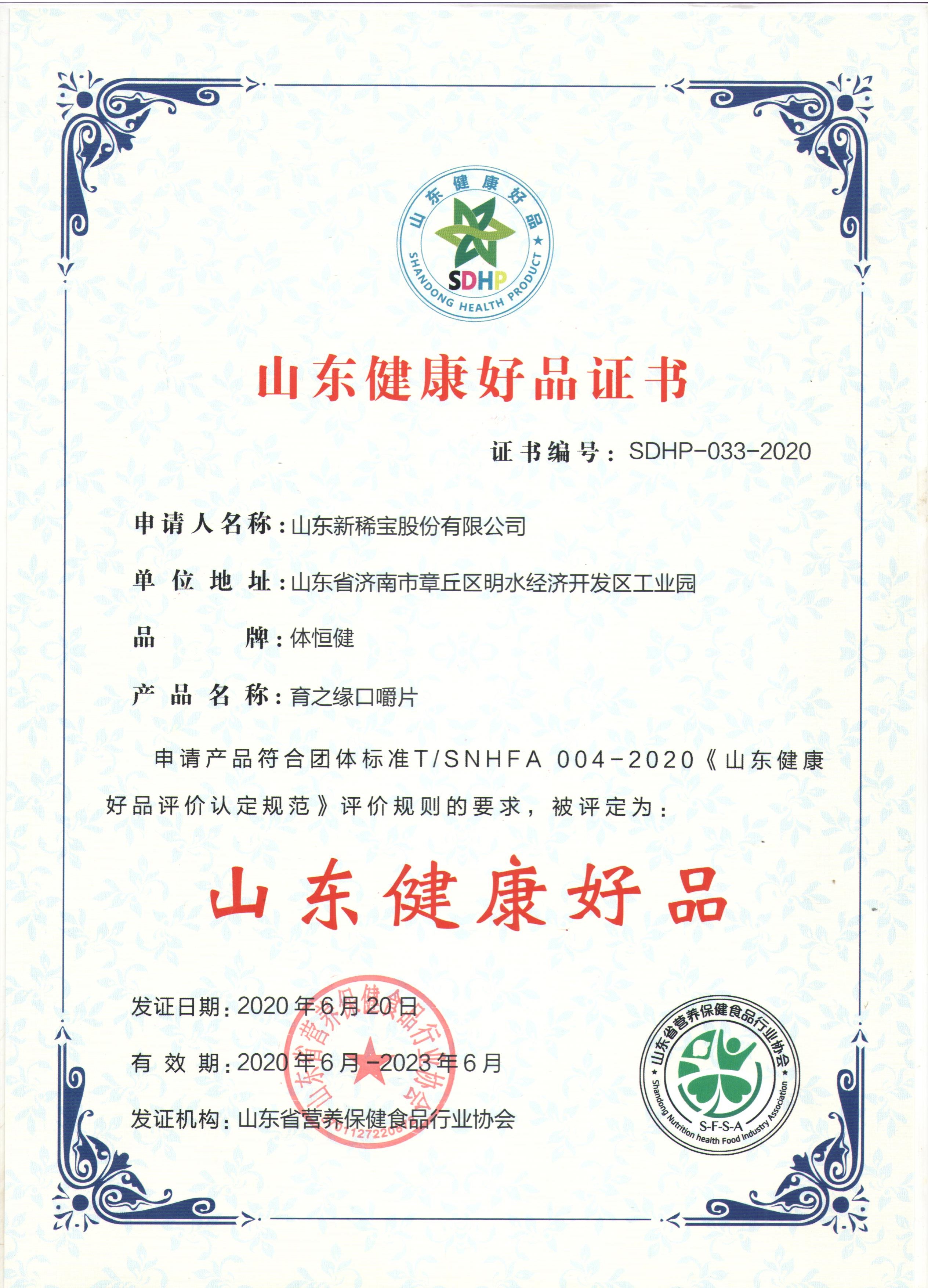 月鋅硒寶片、鐵之緣、硒維康口嚼片、育之緣口嚼片、金棘固體飲料五款產(chǎn)品獲得山東健康好品證書
