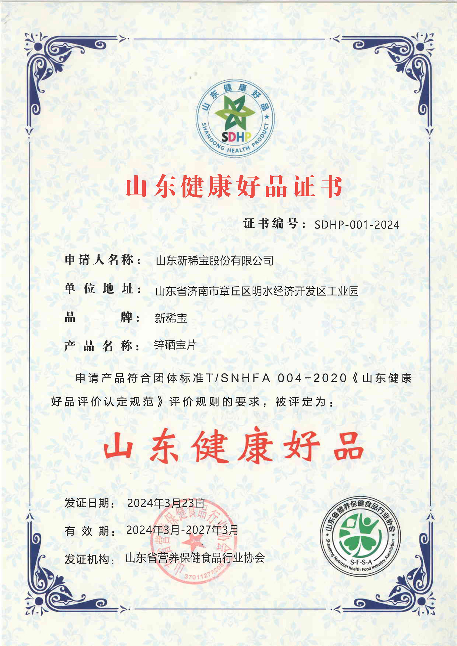 2024年3月23日,山東省營養(yǎng)健康產(chǎn)業(yè)高質(zhì)量發(fā)展論壇在青島順利舉辦,會上公布了第二批山東健康好品獲獎名單。其中,新稀寶集團旗下產(chǎn)品“鋅硒寶片”被二次授予“山東健康好品”的稱號。